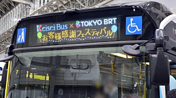 会場内に展示のバスのLED行先表示器に掲出された「お客様感謝フェスティバル」の表示。2024年の撮影。